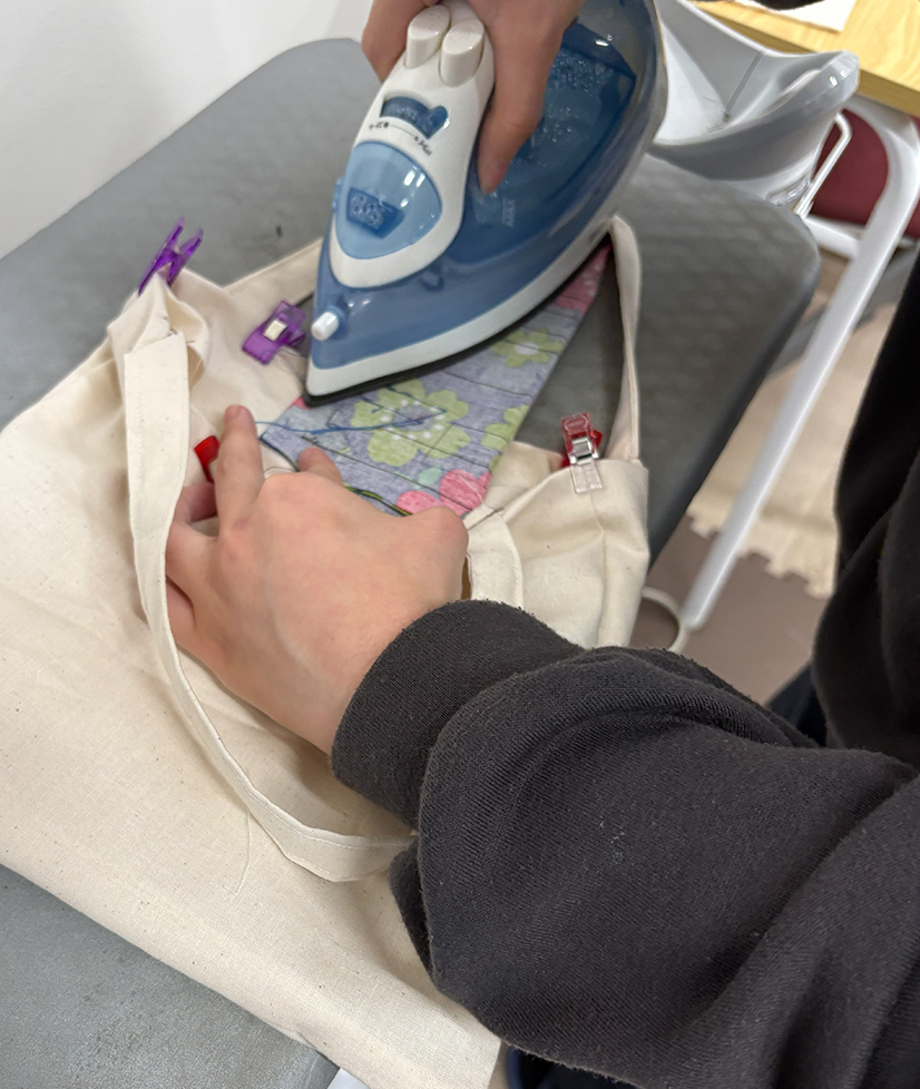 縫い合わせが終わった布トートバッグは、アイロンを使って仕上げの形を整えます。折り目をしっかりつけることで全体の輪郭がはっきりとし、仕上がりの安定につながるため非常に重要な工程です。アイロンの温度管理やあて方によって素材の表情が変わるため、職員がポイントを解説しながら作業を進められるよう配慮されています。