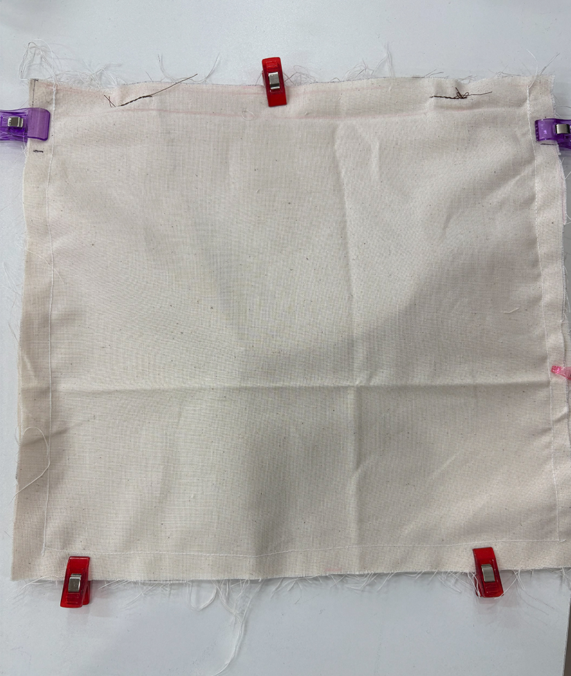 布トートバッグ制作では、最初に生地を重ねて仮止めを行います。生地のずれを防ぎ、縫い合わせの準備を整える大切な段階で、クリップや待ち針を使いながら全体のバランスを整えていきます。仮止めが丁寧に行われることで、後の工程で縫い目が歪みにくくなり、仕上がりの安定につながります。そのため、職員が要所ごとに確認しながら進められるように環境が整えられています