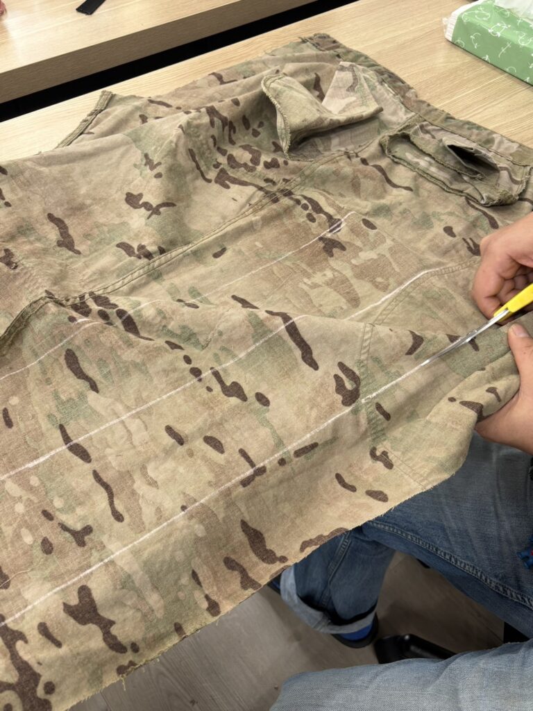 デニムは厚みがあるため、線一本でもズレれば後の縫製に影響する。そのため、利用者さんは定規を押さえ、何度も角度を確認しながらラインを描いていく。視線は鋭く、リズムは一定。作業場には鉛筆のタッチが布を滑る音が静かに残る。