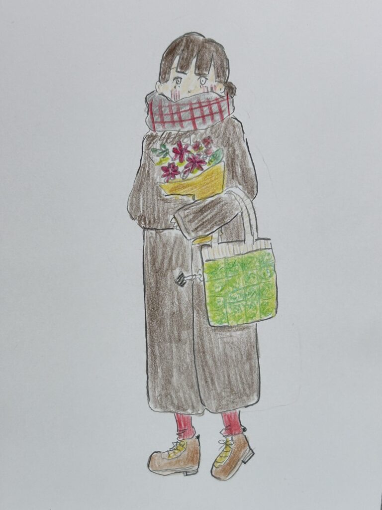色や形のバランスを考えながら描かれており、完成したバッグがよく似合うおしゃれな女性を表現しています。