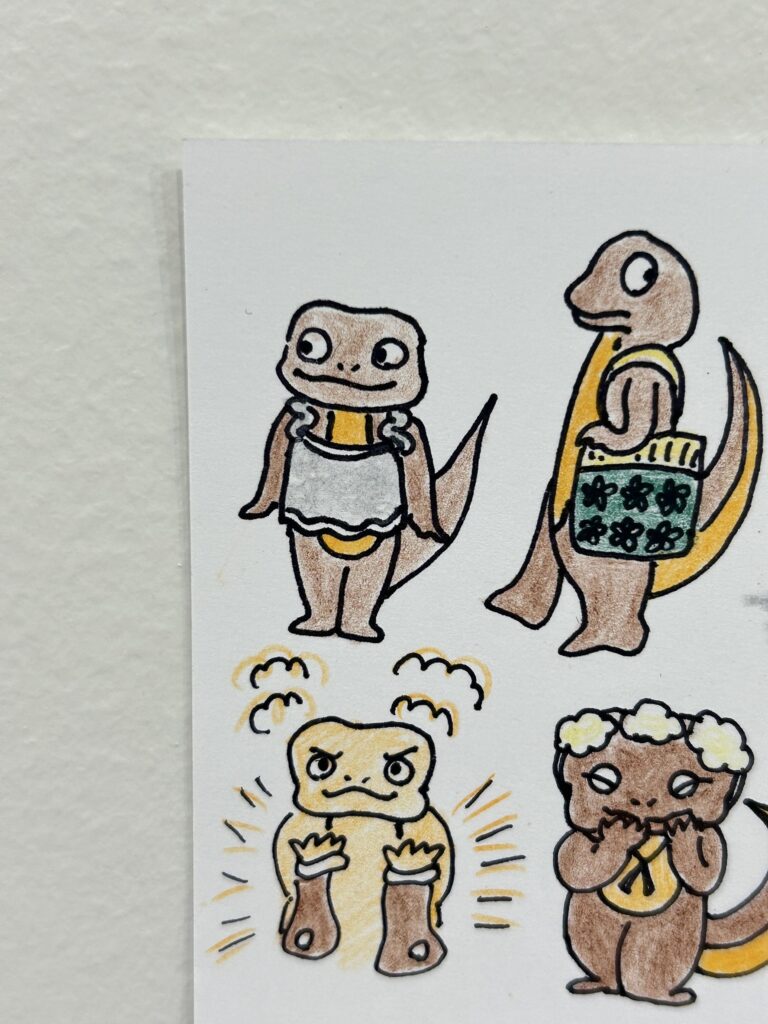 右上のトカゲは、先ほどご紹介した緑のニートトートバッグを持ったトカゲが描かれています。