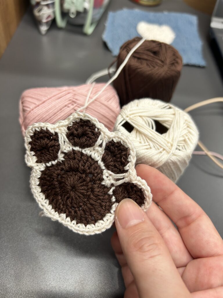 完成した肉球モチーフは、ひとつひとつ表情が異なり、手編みならではのあたたかみを感じさせてくれます。
