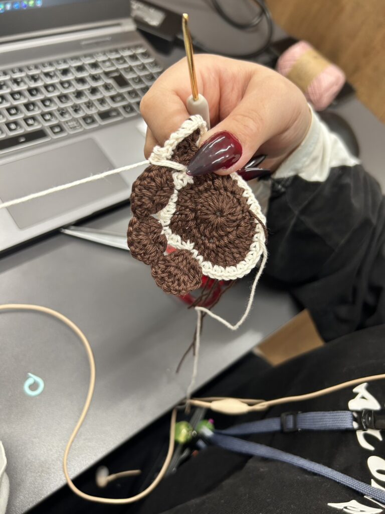 利用者さんは、慣れた様子であっというまに円形の土台を編み、ものの十数分でフチの細編みに取り掛かっていました。
